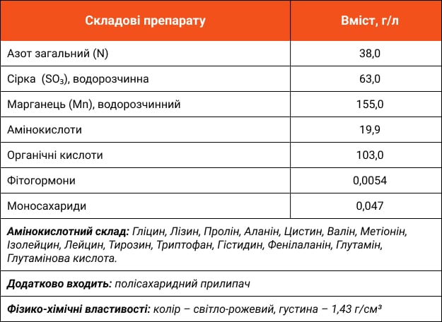 Концентрований розчин легкозасвоюваного марганцю (Mn) в поєднанні з азотом (N) та сіркою (S) на основі унікального, багатофункціонального біологічно-активного комплексу «NANOACTIV», який містить 15 L-амінокислот, широкий спектр фітогормонів, моносахаридів та органічні кислоти.