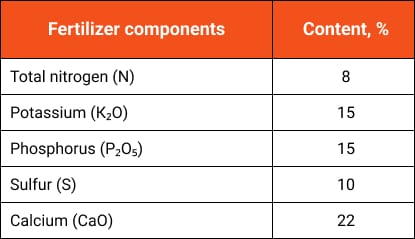 A multi-component, complex fertilizer with high content of nitrogen (N), phosphorus (P), potassium (K), sulfur (S) and calcium (CaO) intended for soil fertilization of all agricultural crops. Designed for all types of soils, especially those with low phosphorus, potassium, sulfur and calcium content.
