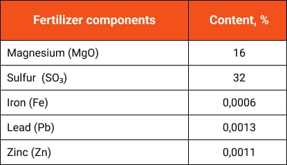 White fine crystalline powder with high magnesium (MgO) and sulfur (SO3), content used for extra-root feeding of all agricultural crops. The fertilizer is made of high-quality raw materials, contains no lead, cadmium, chlorides or other dangerous substances.