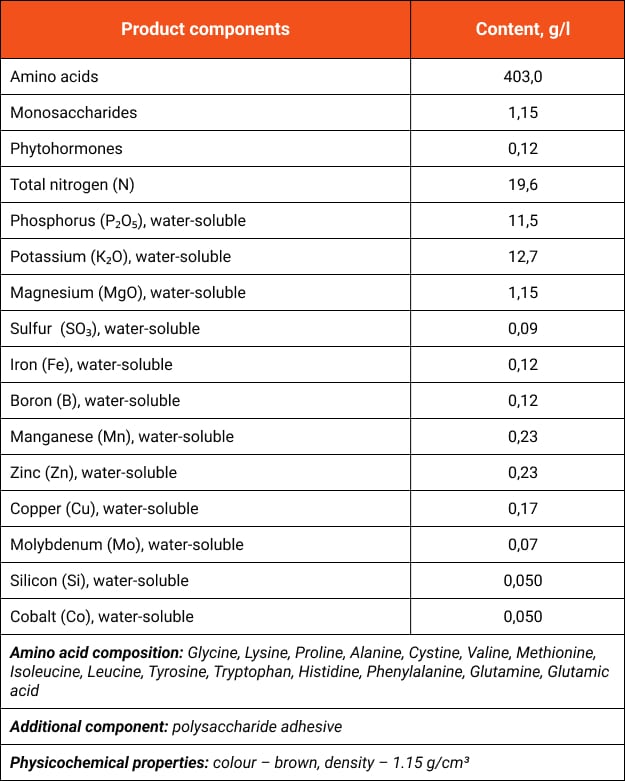 Highly-concentrated complex anti-stress biostimulant saturated with high content of L-amino acids in combination with macro- and microelements and a wide range of phytohormones and monosaccharides.