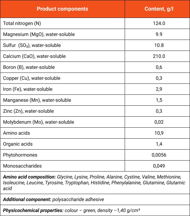 Highly efficient calcium (Ca) fertilizer in combination with nitrogen (N), magnesium (Mg), and a wide range of microelements based on the unique, multifunctional biologically active complex "NANOAСTIV" containing 15 L-amino acids, phytohormones, monosaccharides, and organic acids.