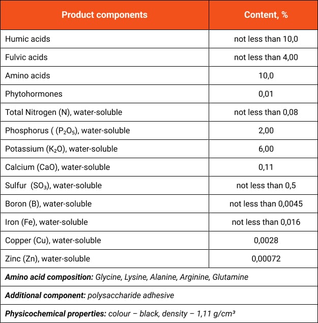Highly-concentrated organic fertilizer based on potassium humate with high humic and fulvic acids content, L-amino acids and phytohormones in combination with wide range of macro- and microelements. Recommended for seed treatment, extra-root (foliar) feeding of all field crops, fruit trees, grapes, vegetables in open and closed soil, flowers, etc.