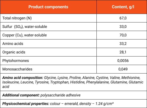 Concentrated solution of easily absorbable copper (Cu) in combination with nitrogen (N) and sulfur (S) based on the unique, multifunctional biologically active complex "NANOAСTIV" containing 15 L-amino acids, wide range of phytohormones, monosaccharides, and organic acids.