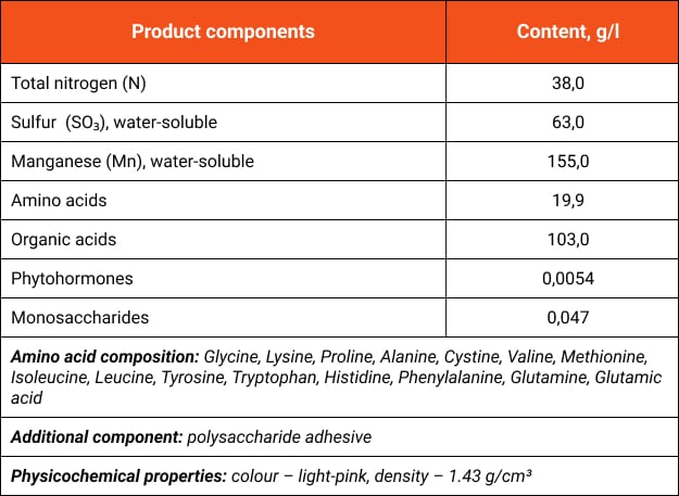 Concentrated solution of easily absorbable manganese (Mn) in combination with nitrogen (N) and sulfur (S) based on the unique, multifunctional biologically active complex "NANOAСTIV" containing 15 L-amino acids, wide range of phytohormones, monosaccharides, and organic acids.