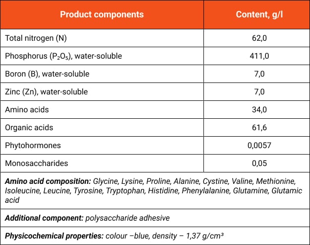 Highly concentrated phosphorous (P) fertilizer in combination with Nitrogen (N), Boron (В), and Zinc (Zn) based on unique multifunctional biologically active complex "NANOAСTIV" containing 15 L-amino acids, wide range of phytohormones, monosaccharides, and organic acids.