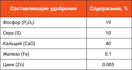 Многокомпонентное комплексное удобрение с высоким содержанием фосфора (Р), серы (S) и кальция (Са) в сочетании с микроэлементами, предназначенное для почвенного удобрения всех сельскохозяйственных культур. Предназначено для применения на всех типах почв, особенно характеризующихся низким содержанием фосфора, серы и кальция.
