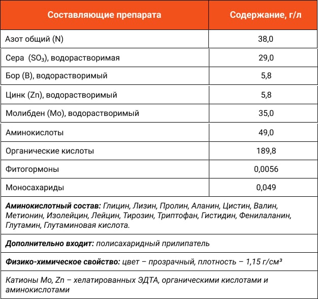 Концентрированный раствор легкоусвояемого молибдена (Mo) в сочетании с азотом (N), серой (S), бором (В) и цинком (Zn) на основе уникального, многофункционального биологически активного комплекса «NANOACTIV», содержащего 15 L-аминокислот, широкий спектр фитогормонов, моносахаридов и органических кислот.