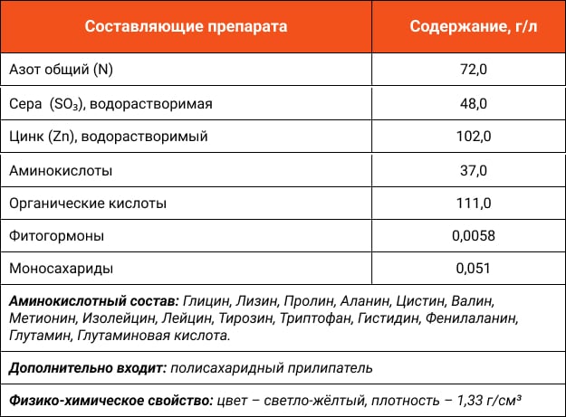 Концентрированный раствор легкоусвояемого цинка (Zn) в сочетании с азотом (N) и серой (S) на основе уникального, многофункционального биологически активного комплекса «NANOACTIV», содержащего 15 L-аминокислот, широкий спектр фитогормонов, моносахаридов и органические кислоты.