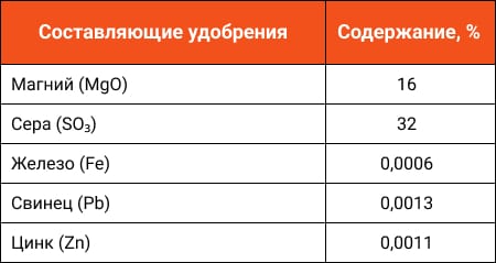 Мелкокристаллический порошок белого цвета с высоким содержанием магния (MgO) и серы (SO3), применяемый для внекорневой подкормки всех сельскохозяйственных культур. Удобрение производится из высококачественного сырья, не содержит свинца, кадмия, хлоридов и других опасных веществ.